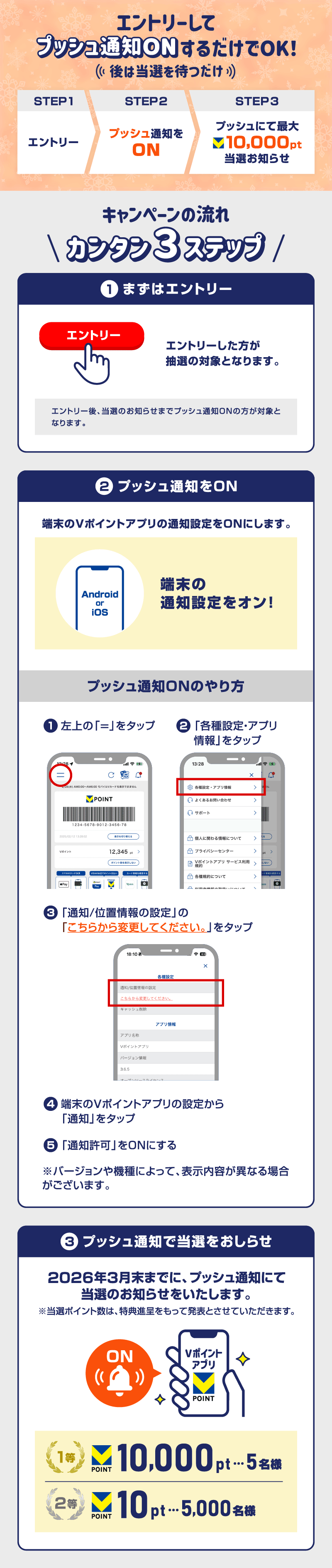 ・お客様のスマートフォン側でプッシュ通知をOFFにした場合は、Vポイント付与の対象外となります。