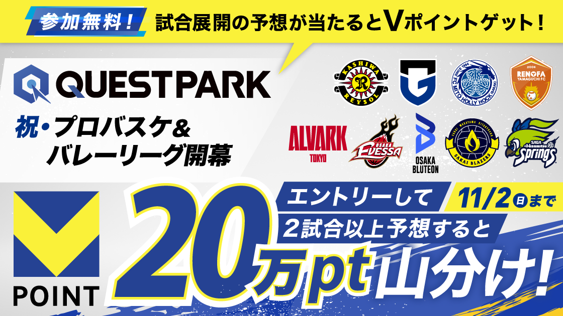 スコアやシュート数、活躍選手など予想が的中するとVポイントがもらえるサービス「QUESTPARK」がオープン!