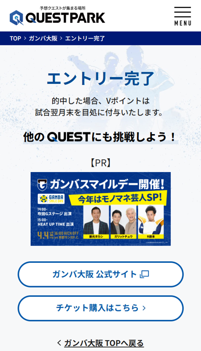 ・期間中に試合会場から本キャンペーンページにアクセスしてエントリーボタンを押し、QUESTPARKにて対象クラブのいずれかの試合予想を完了した方が対象となります。