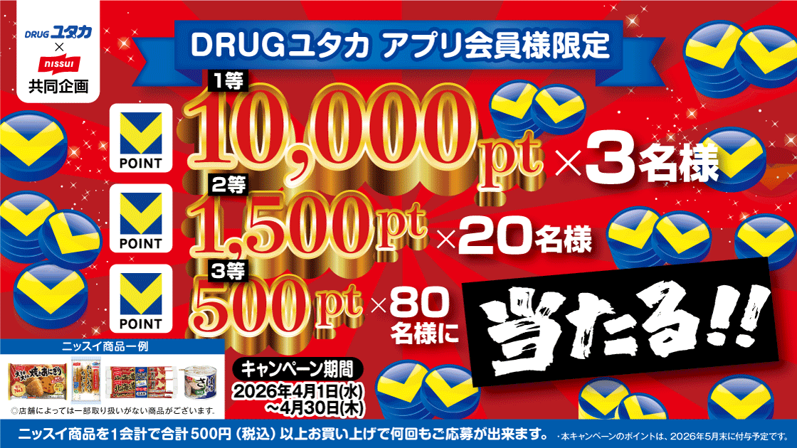 ・キャンペーンエントリー後に、DRUGユタカでニッスイ商品を500円(税込)以上購入すると、抽選で合計100名様にVポイントが最大10,000ポイントが当たる!