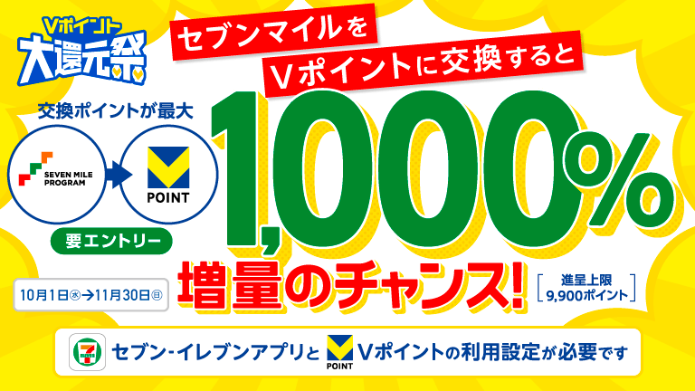 【Vポイント大還元祭】セブンマイルからVポイントに交換すると抽選で最大1,000%増量!