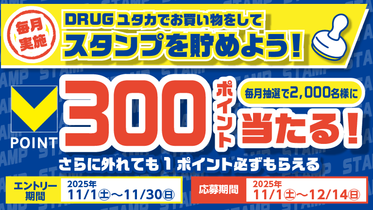 【DRUGユタカ】500円毎のお買い物でスタンプを貯めよう!