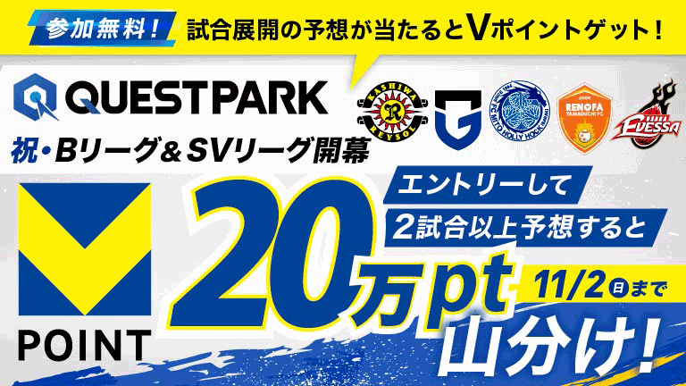 【参加無料】スポーツの試合予想チャレンジ!20万ポイント山分けキャンペーン「QUESTPARK」
